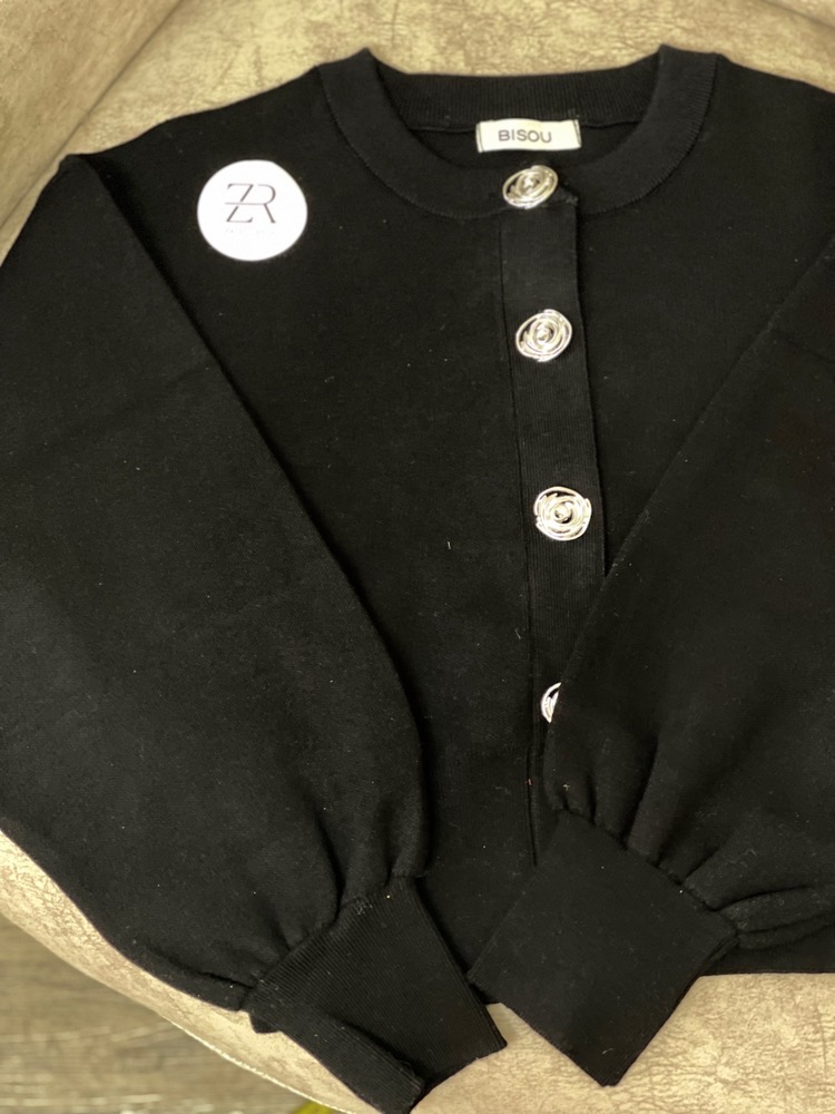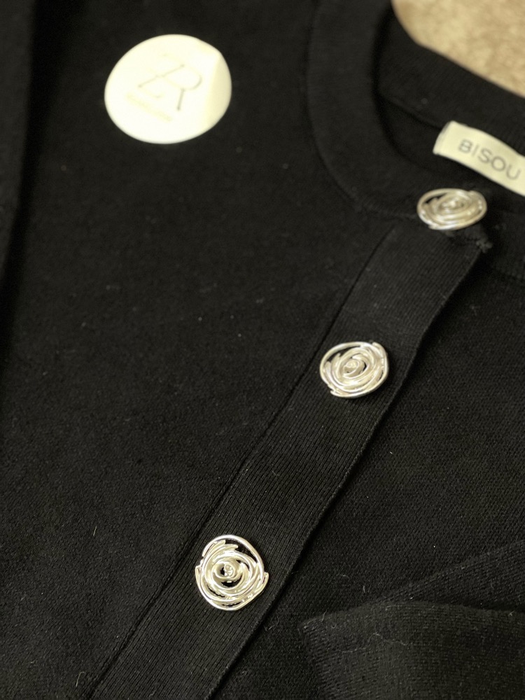 بلوز بافت زنانه برند Bisou با دکمههای گل فلزی، بافت نرم و کشسان و تنخور مرتب.