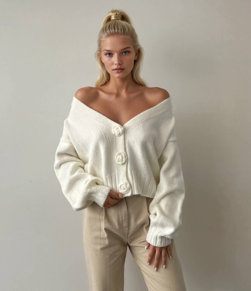 یقهٔ V و دکمههای درشت بافتی، ظاهر این کاردیگن را متفاوت و لوکستر کرده و حس یک کار دستساز شیک به آن میدهد.