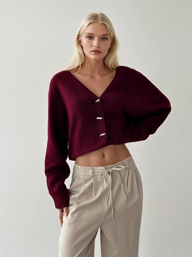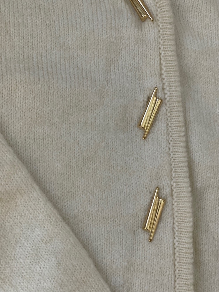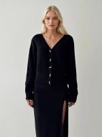 طراحی یقه V به همراه دکمههای لاینی فلزی، جلوهای خاص و متفاوت به این کاردیگن داده و آن را از مدلهای معمولی کاملاً جدا میکند.