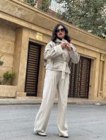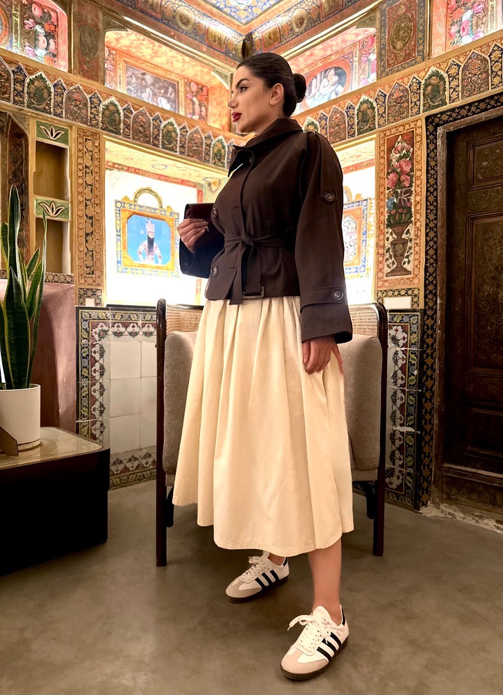 یقهی پهن، دکمههای درشت و کمربند همجنس، استایل کلاسیک را با حسی مدرن ترکیب کردهاند.